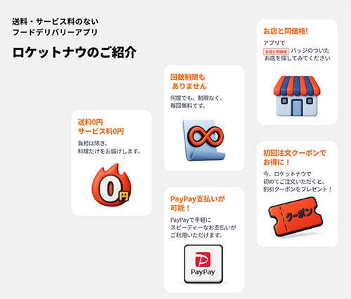 ロケットナウは「送料・サービス料無料」を明確に打ち出し、フードデリバリーの“合計金額が膨らむ不満”に正面から応えるサービスです。